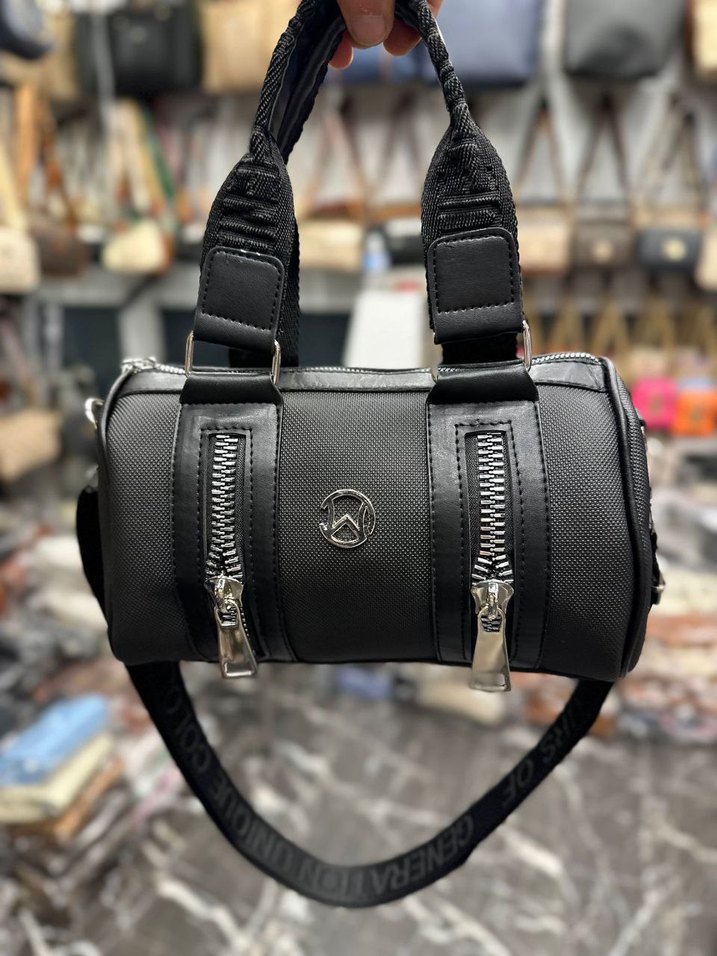 Tokalı askılı, baskılı detaylı siyah deri kadın çantası. Sokak modası ve rock punk havası taşıyor. Günlük kullanıma uygun.