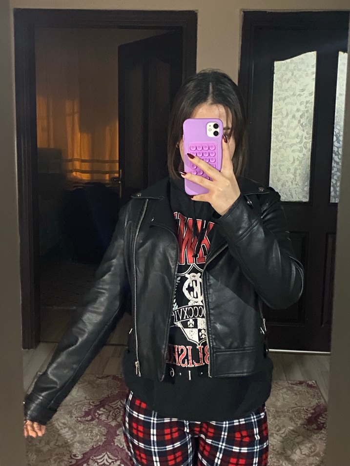 Uzun kollu, kemerli detaylı, siyah deri ve baskılı baskılı, normal boy, kadına özel rock punk tarzında ceket.