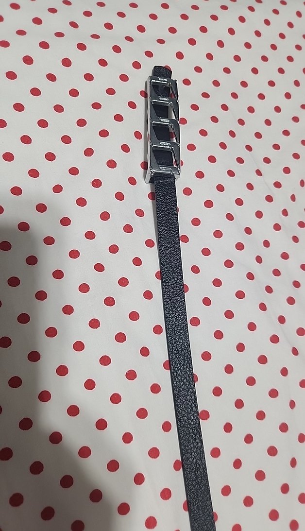 Siyah deri, rock punk tarzı kadın kemeri, minimalist görünümlü özel gümüş tokasıyla. 105 cm