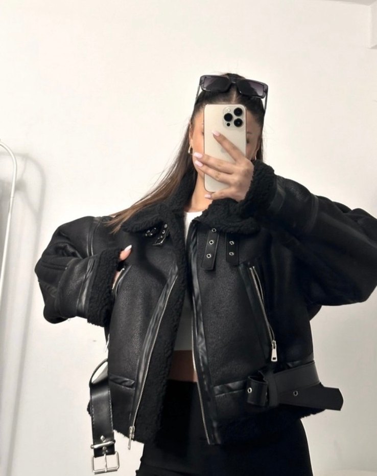 Kemerli detaylara ve askısız yakaya sahip, günlük sokak stiline uygun siyah deri rock punk tarzı dar kesim ceket. Sadece kemeri yoktur