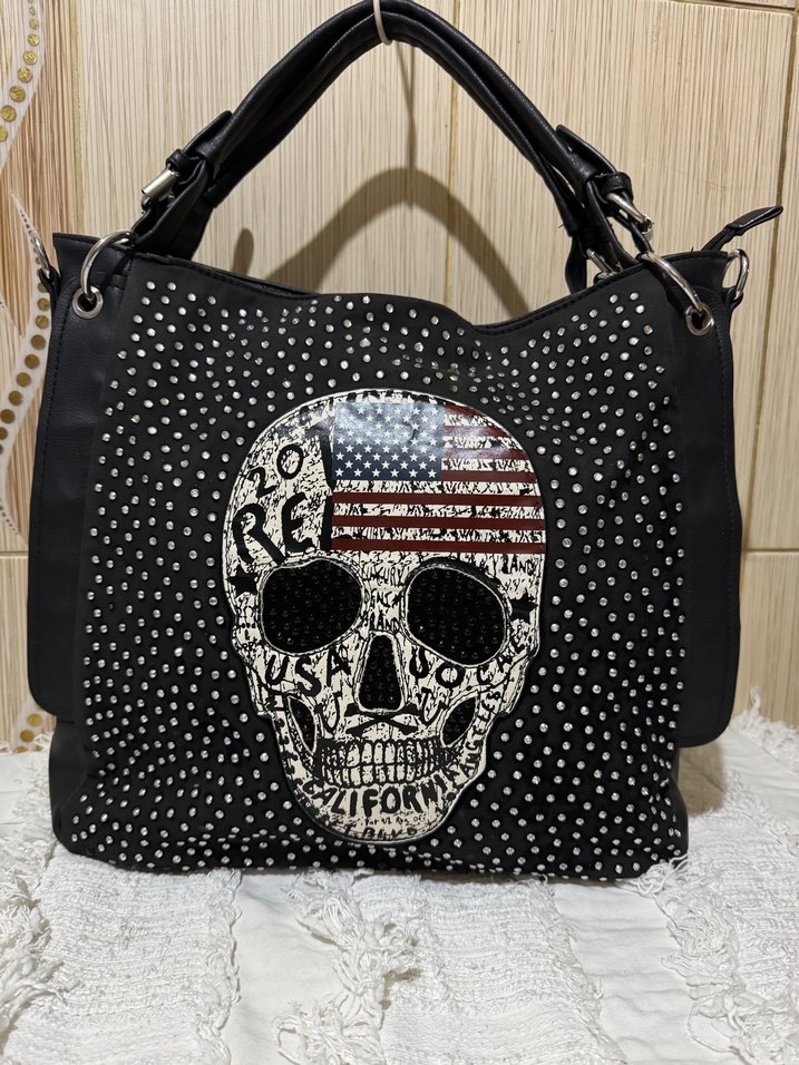 Siyah deri çanta, nakışlı kafatası ve pul işlemeleriyle rock punk tarzını yansıtıyor, günlük kullanım için uygun. Yurt dışından Gothic-punk kuru kafalı çanta American vintage, büyük boy, ön gövde kanvas üzerine taşlı kuru kafa, geri kalan deri, uzun askı yoktur. Hasarsız temiz, içi 2 bölme ve cepler var.Boy 36 cm, en 46 cm, taban genişlik 14 cm. İade almıyorum detay sorun lütfen.