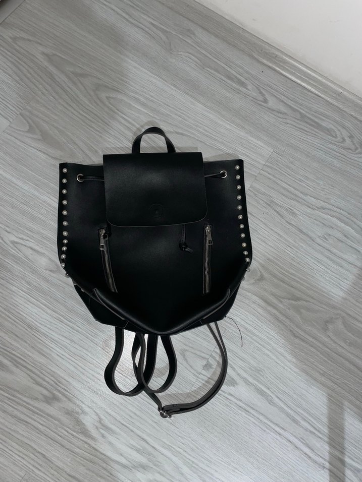 Siyah deri sırt çantası, tokalı kapak ve yanlarda gümüş çıtçıt detaylarıyla minimal rock punk tarzını yansıtıyor. Günlük kullanım için uygun, desensiz ve düz yüzeylidir.