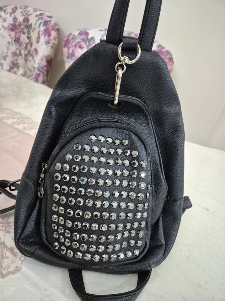 Siyah deri, tokalı ve taşlı detaylara sahip rock punk tarzı sırt çantası. Grunge punk havası verir, günlük kullanım için uygundur.