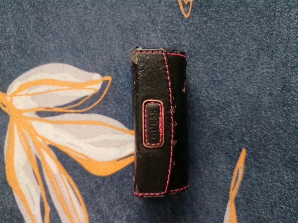 Pembe dikiş detaylı, baskılı siyah deri kadın ruj kutusu. Buckle detaylı, günlük kullanıma uygun trend bir model. az kullanılmıştır aynalidir guess markadir