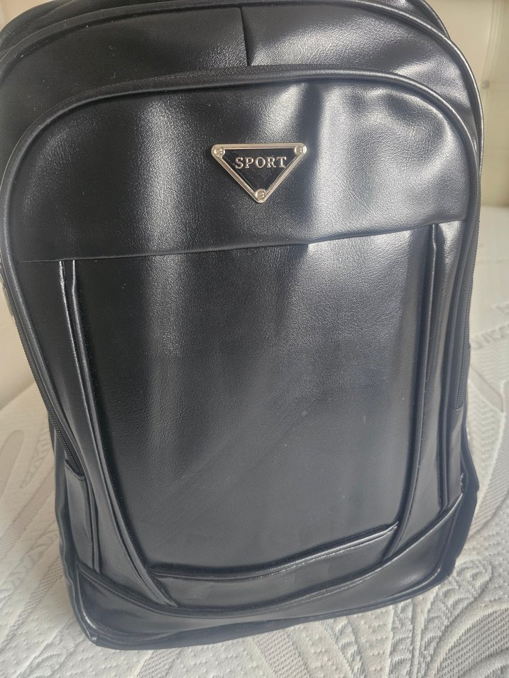 Parlak siyah deri sırt çantası, tokalı detaylara sahip. "SPORT" logosu bulunur; sokak stili ve günlük kullanıma uygundur.