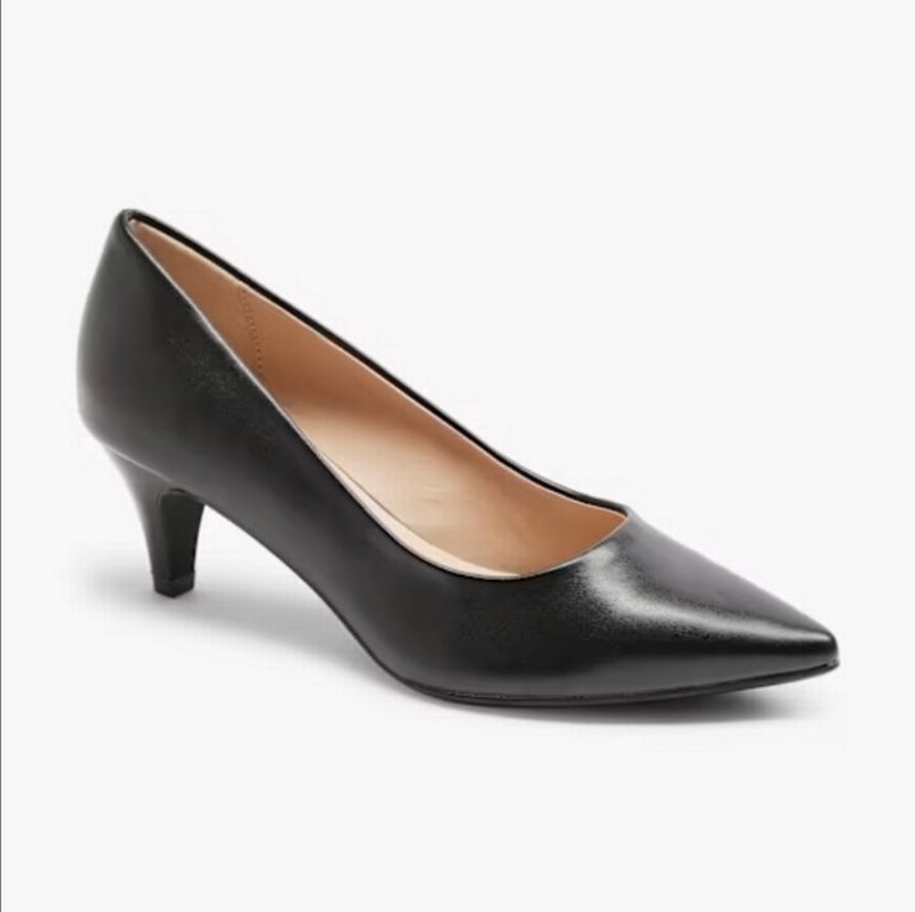 Modern klasik tasarımlı siyah deri stiletto, sivri burun ve rahat topuk yüksekliğiyle ofis için zahmetsiz şıklık sunar.