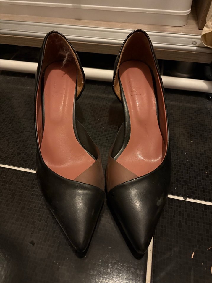 Siyah deri, sivri burunlu stiletto topuklu ayakkabılar, tokalı detaylarla ofis kullanımı için şık ve çağdaş bir tasarıma sahiptir.
