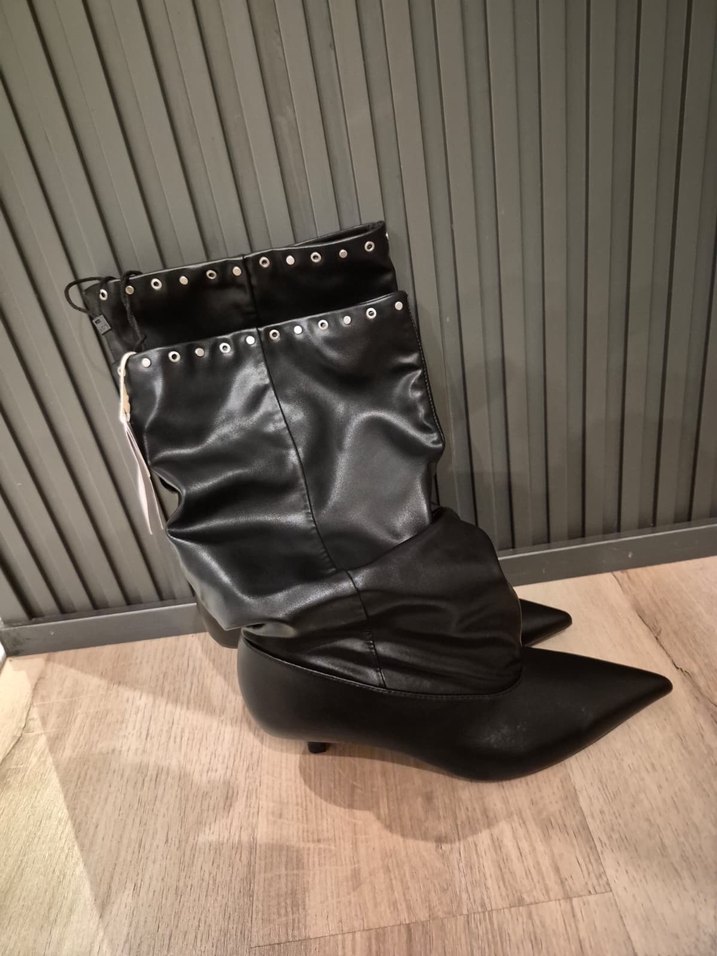 Siyah deri diz boyu botlar, stiletto topuklu ve tokalı detaylara sahip. Cesur ve avant-garde tarz için uygun. Günlük kullanım için idealdir.