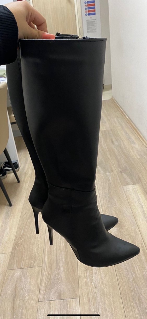 Siyah deri dizüstü botlar, stiletto topuk ve tokalı detaylarla gotik tarzda cesur bir görünüm sunar, ofis için uygundur. sadece iki kere giyildi yeni gibi 1.5kya almıştım