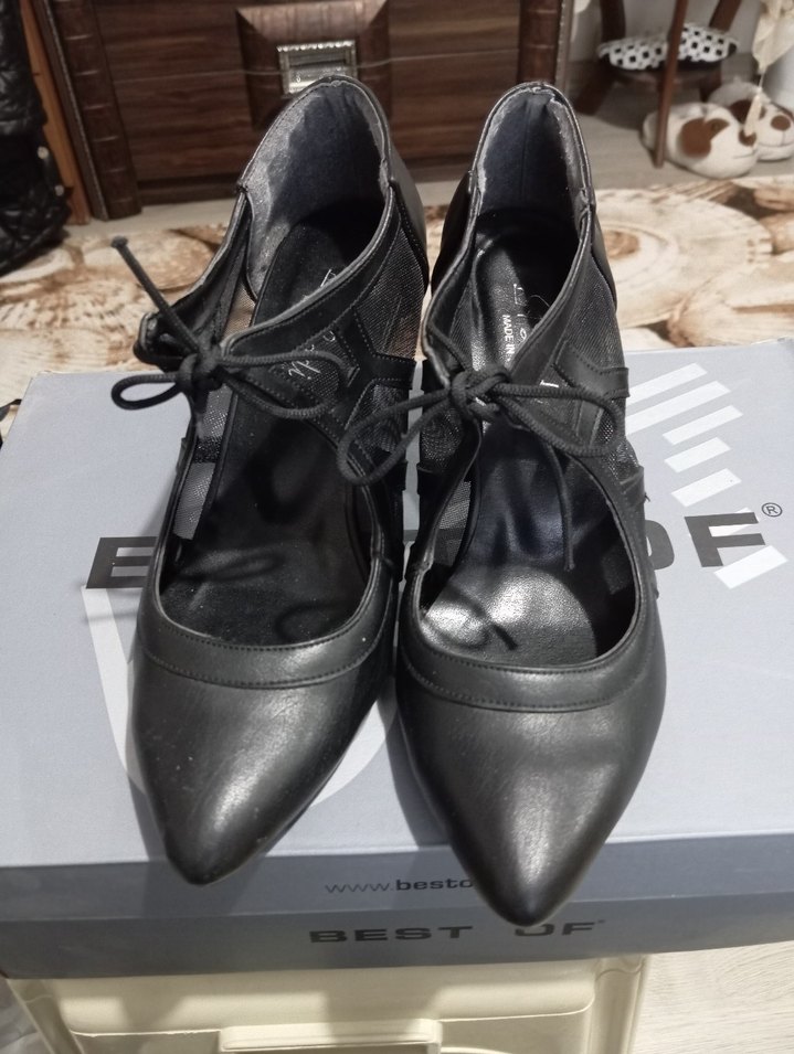 Siyah deri stiletto topuklu, tokalı detaylara sahip kadın ayakkabısı. Gotik ve avangart tarz için uygundur. Ofis kullanımı için şık ve desensiz.