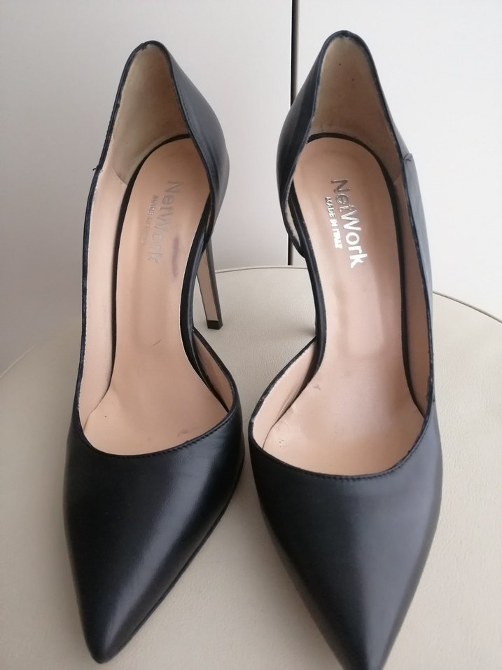 NetWork markalı siyah deri stilettolar, sivri burunlu ve bağcıklı detaylı, klasik ofis şıklığı için minimal tasarım.