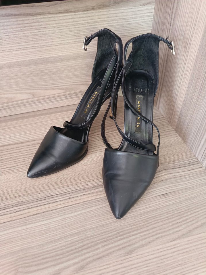 Siyah deri, sivri burunlu ve tokalı bilek kayışlı stiletto topuklu ayakkabılar, minimalist gotik tarzda ve ofis kullanımı için uygun.
