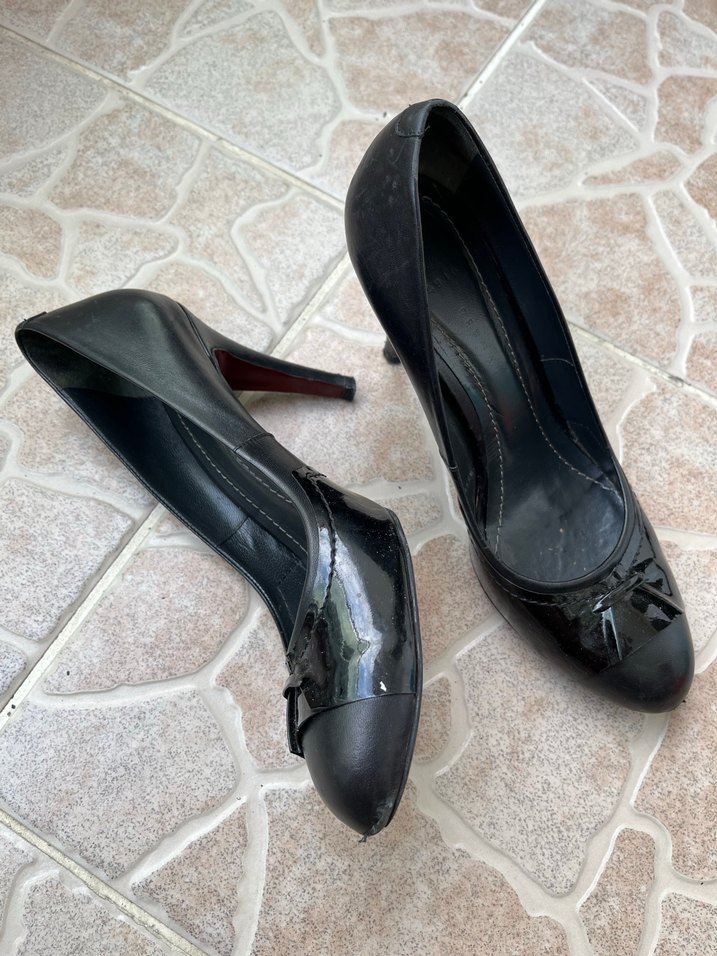 Siyah, deri stiletto topuklu ayakkabı. Topuk kısmında ve uç kısımlarında kullanıma bağlı hafif deformeler bulunuyor, detaylarını fotoğraflarda görebilirsiniz.