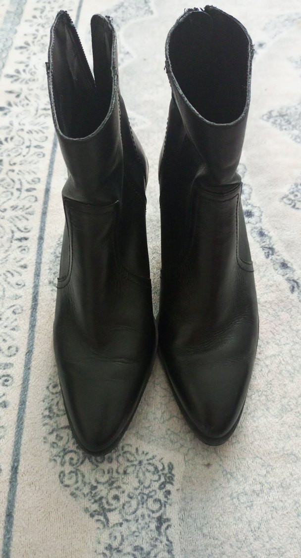 Siyah deri stiletto topuklu kadın botları, tokalı detaylıdır. Minimalist goth tarzında, günlük kullanıma uygundur. Desensiz ve şık tasarım.