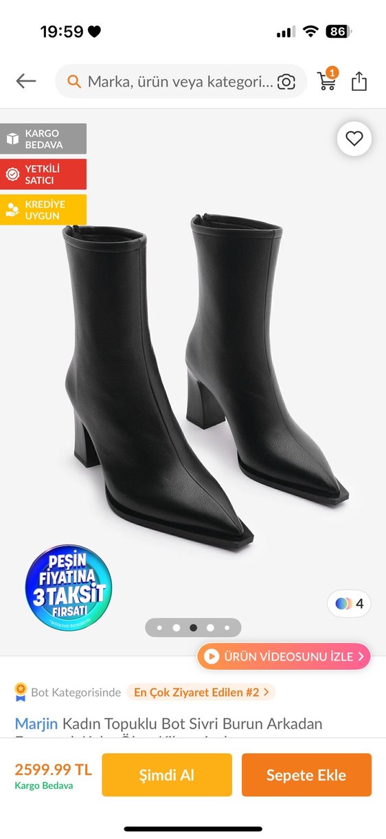 Siyah deri, stiletto topuklu kadın bot geçen sene almıştım fakat çok kullanamadım sert bir derisi var içinden dolayı da sıcak tutuyor bacağı direkt sarıyor kalın bacaklıysanız uygun olmayacaktır hiçbir problemi yok ayağıma uygun olmadığı için satıyorum bol pantolonların altında da sivri uçlu olduğundan çok şık duruyor iki fermuarlı da çalışıyor