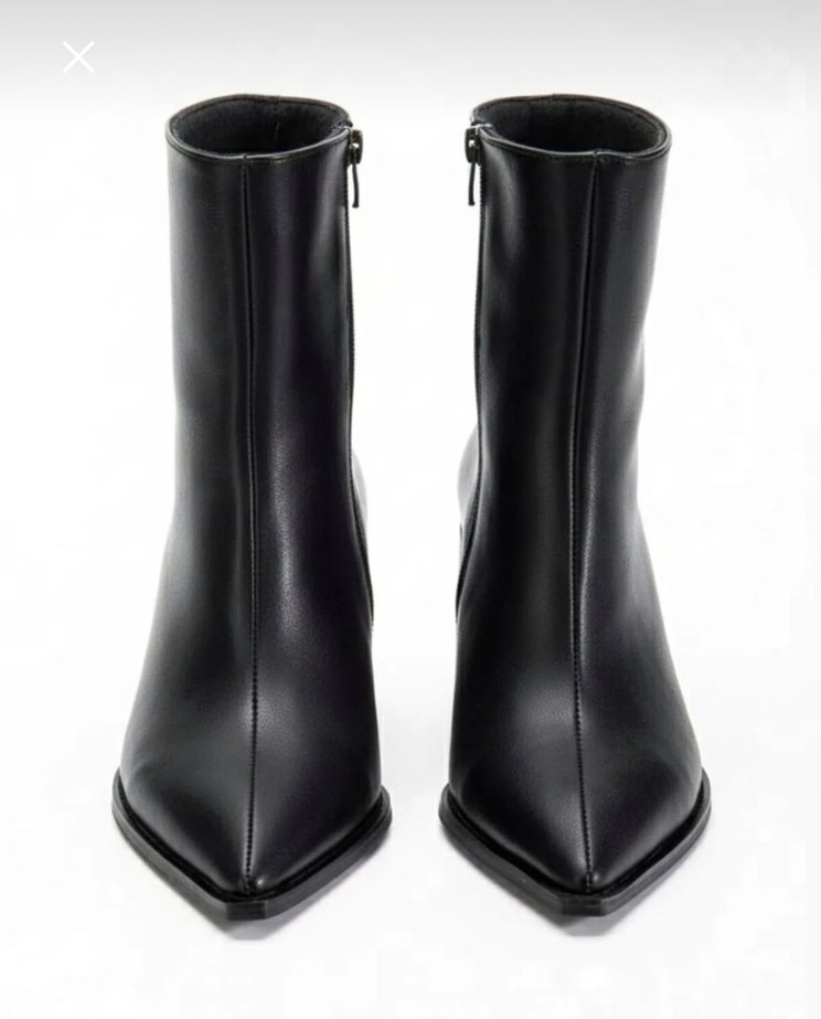 Siyah deri, stiletto topuklu kadın bot. Yanında fermuar bulunur, minimalist ve şık gotik tarzda tasarlanmıştır. Günlük kullanım için uygundur.