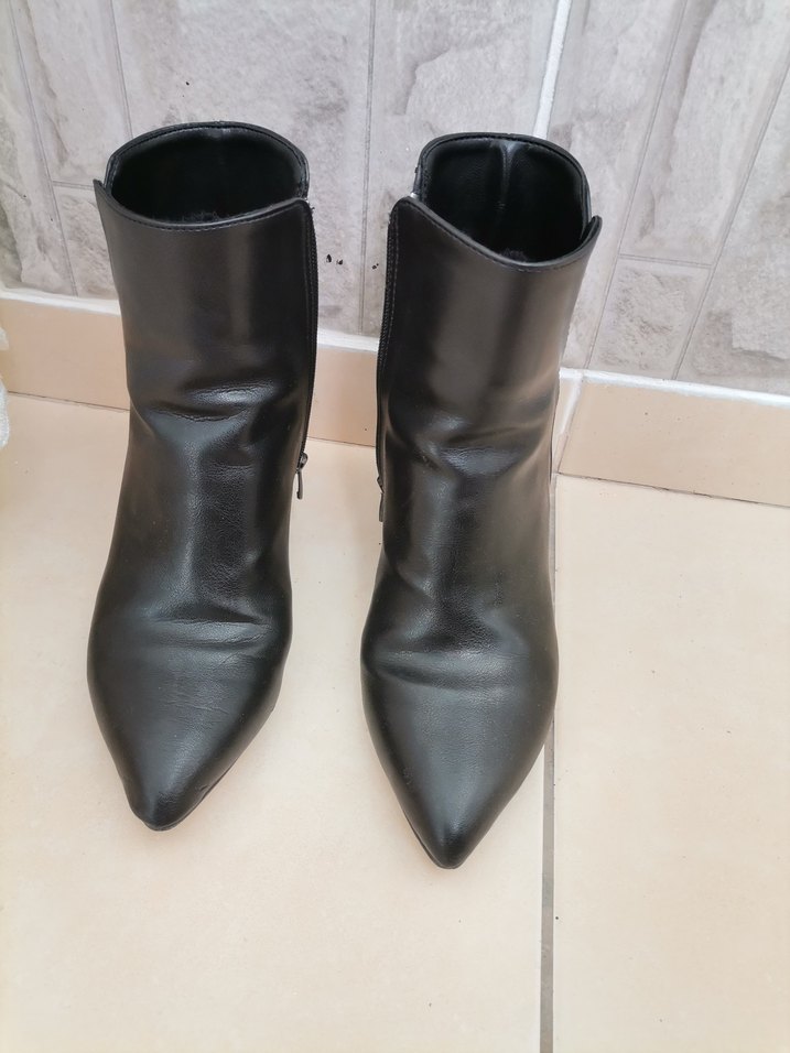 Siyah deri botlar, stiletto topuk ve zarif detaylara sahip. Cesur, minimalist tarzda, günlük kullanıma uygun.