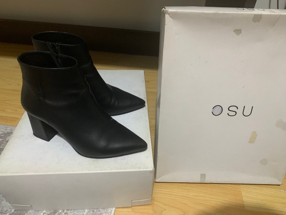 Siyah deri stiletto topuklu kadın bot, tokalı ve minimalist tasarıma sahip, ofis kullanımı için uygun.