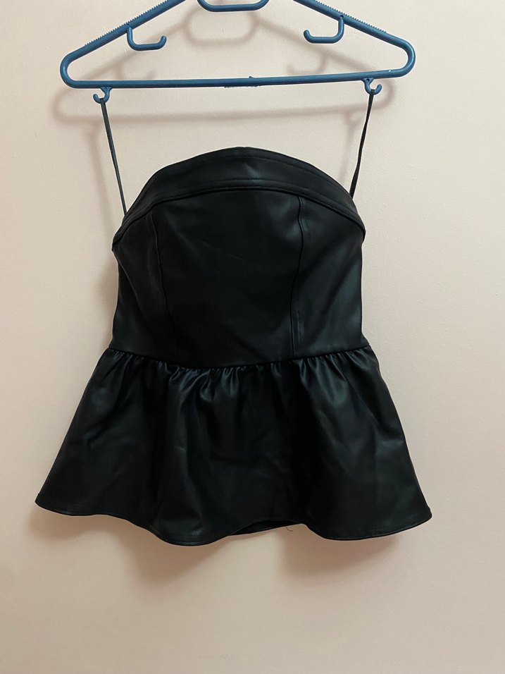 Siyah deri bustiyer, straplez yaka ve fırfırlı etek ucu
