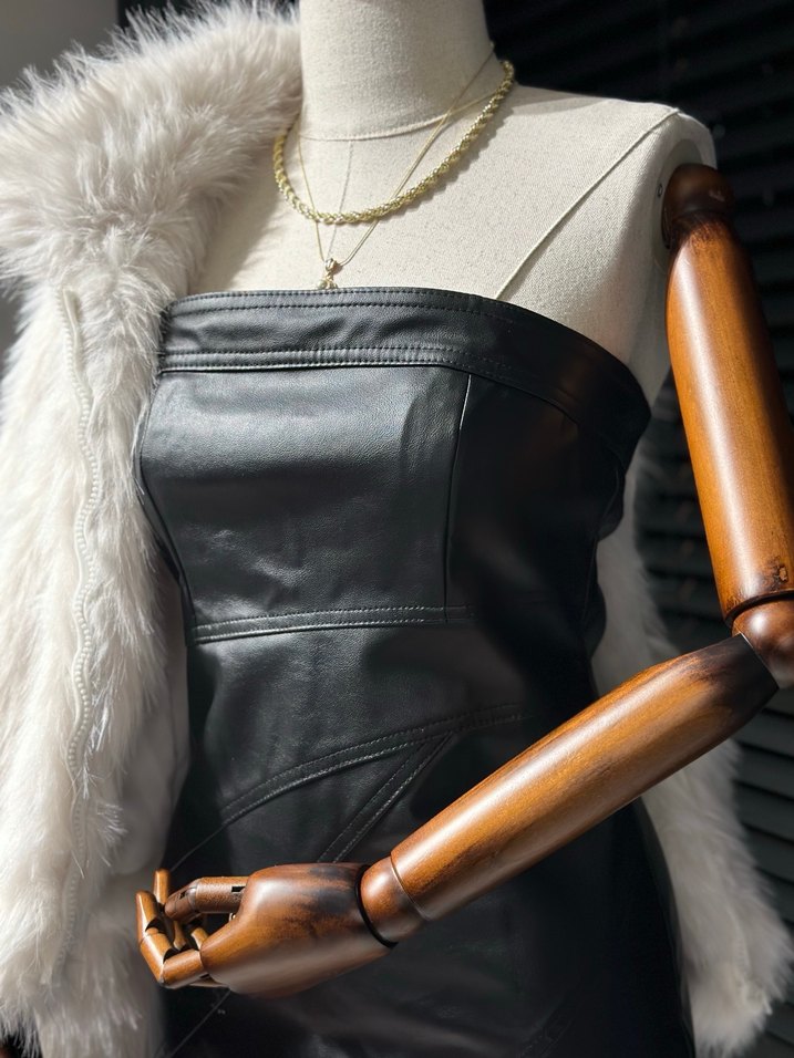 Siyah deri, straplez ve uzun kesimli bu dar elbise parlak dokusu ve kürk detaylarıyla günlük kullanıma uygun şık bir goth tarzı sunar.