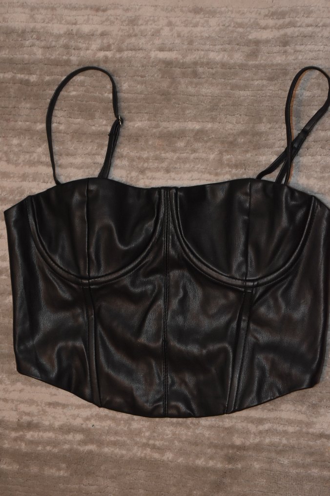 Siyah deri, ayarlanabilir askılı ve straplez yakalı, tokalı detaylara sahip, vücuda oturan gotik tarzda büstiyer.