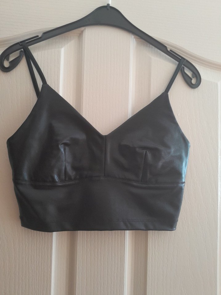 Siyah deri bustiyer, ince askılı ve V yakalı, kısa mini boyda, fit kesimle cesur gotik tarzı yansıtıyor. Günlük kullanıma uygun.