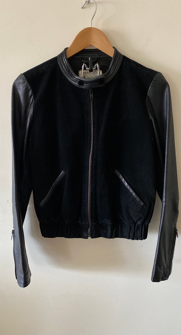Bu siyah, deri biker ceket, yüksek yakalı ve fermuarlı ön yapıya sahiptir. Uzun kollu ve midi boyda, şık ofis stiline uygundur.