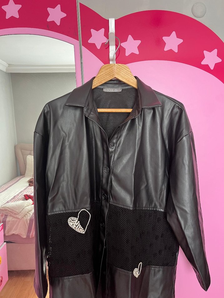 Siyah deri kumaştan yapılmış taş detaylı gömlek. Sokak stili ve ofis kullanımı için uygundur.