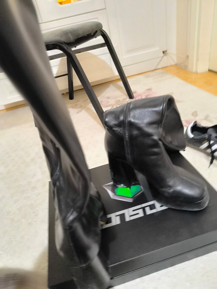 Siyah deri, yüksek topuklu ve tokalı dizüstü çizme, gotik tarzda şık bir sokak görünümü için uygundur.