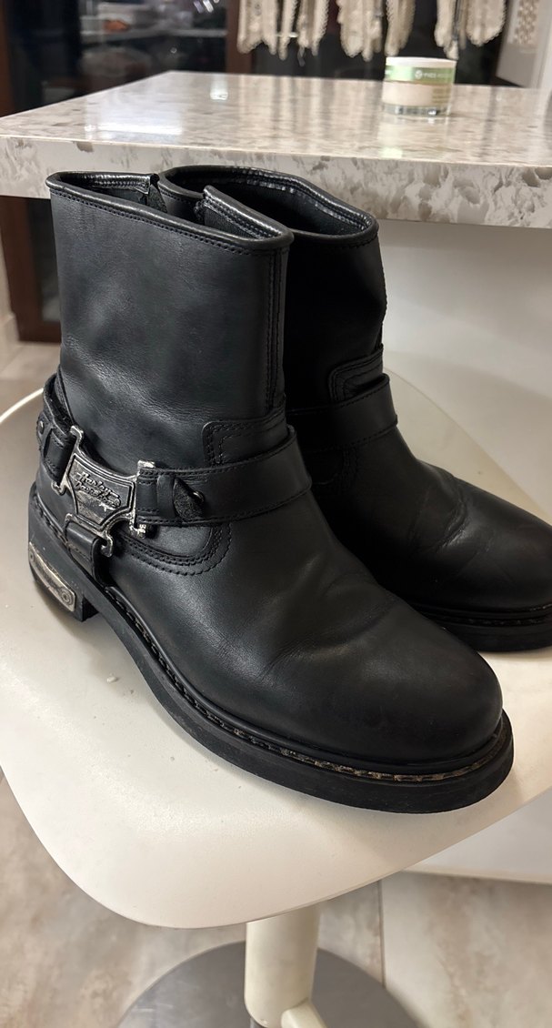 Harley Davidson orijinal Siyah deri, tokalı biker botlar; desen içermeyen, koyu gotik rock punk havasıyla günlük kullanıma uygun. Arka boğaz kısmında fotoğrafladığım yerde dikişinde sökülme var normalde çok az giyildi başka hiçbir sorunu tok çok kaliteli içi dışı tertemiz bu yüzden fiyatı uygun tutuyorum iade kabul etmem