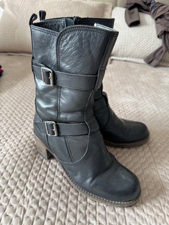 Siyah deri, tokalı kayışlara ve kalın topuklara sahip biker botlar. Rahat ve günlük kullanım için uygundur.