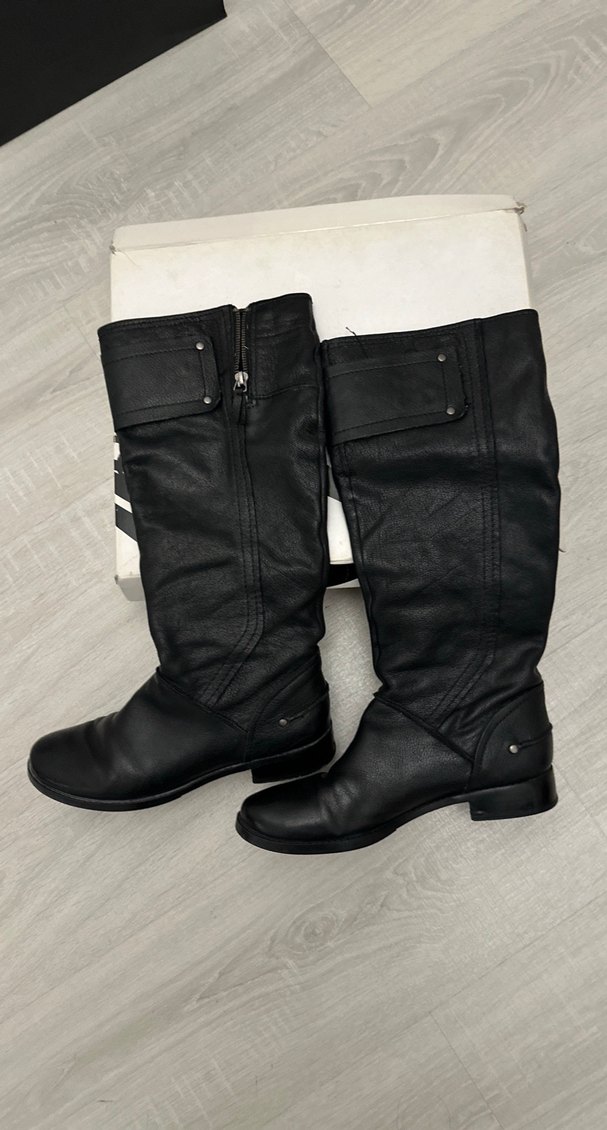 Siyah deri dizüstü biker çizme, tokalı detaylar ve blok topuklu, trendi günlük stil için uygundur.