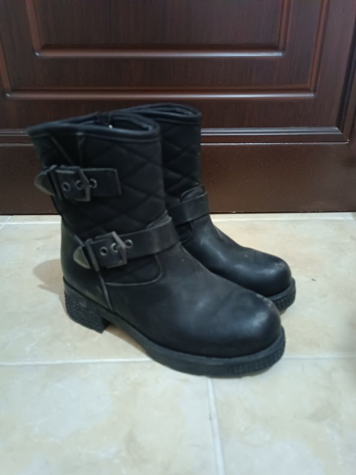 Siyah deri, tokalı kayışlı ve blok topuklu biker tarzı kadın botu. Üst kısmı kapitone detaylı, günlük kullanıma uygun.
