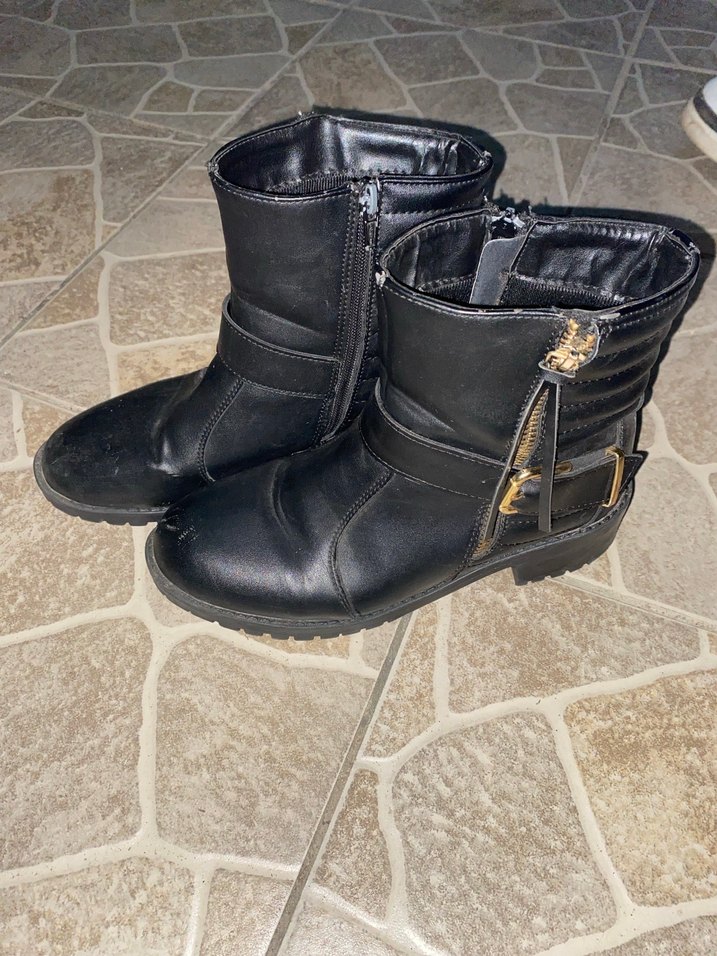 Siyah deri, tokalı ve yan fermuarlı biker tarzı kadın botları. Dolgu topuklu, desensiz ve günlük kullanıma uygun grunge punk tarzında.