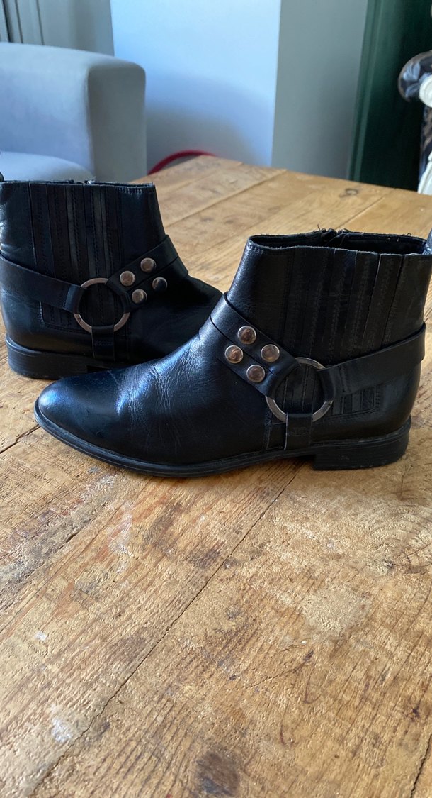 Tokalı kayışları ve kalın topukları olan siyah deri biker botlar. Grunge punk tarzını yansıtır, günlük kullanıma uygun.