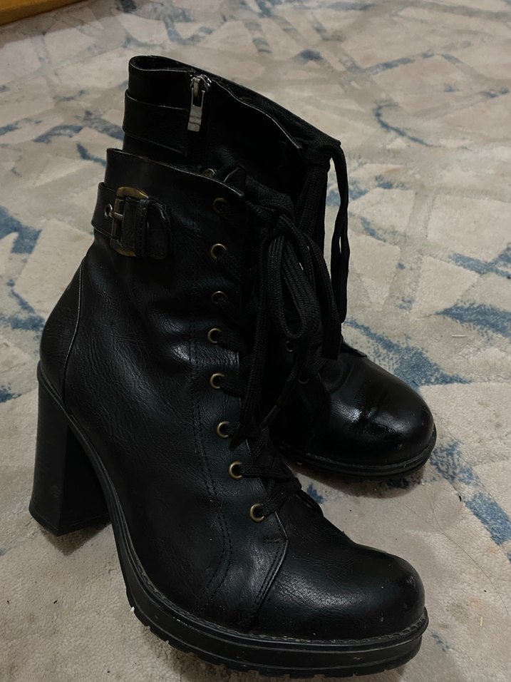 Tokalı ve bağcıklı siyah deri blok topuklu botlar. Goth ve grunge punk tarzında desenli, şık ve rahat günlük kullanım için uygun. ⚫