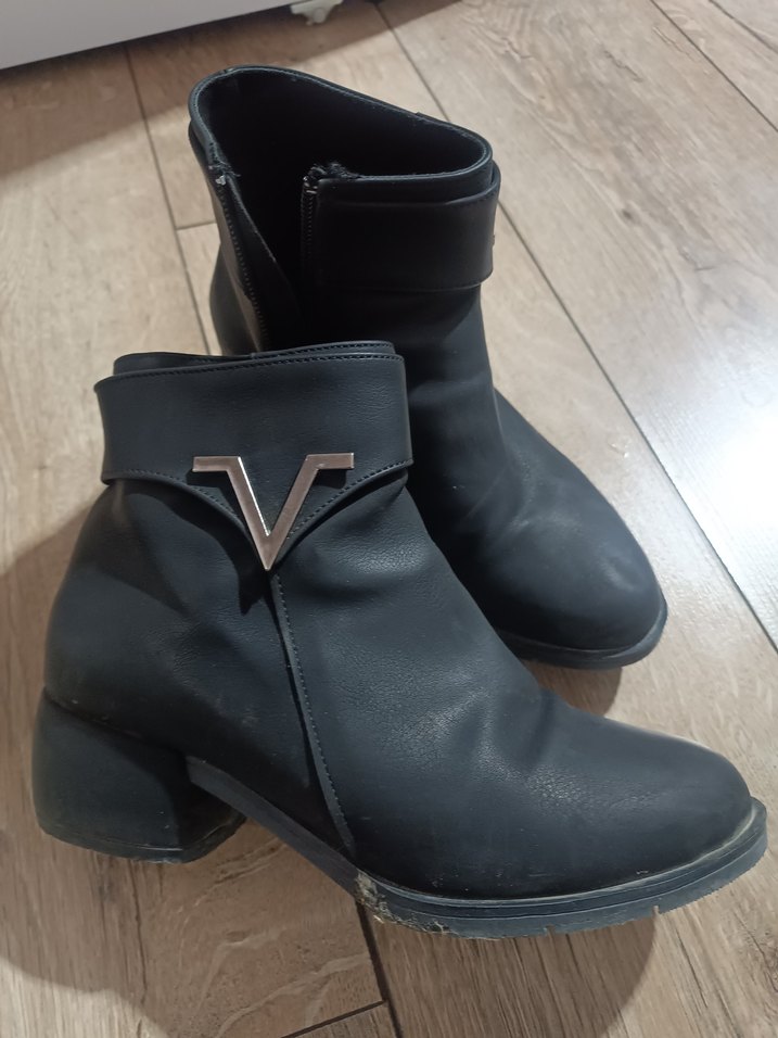 Siyah deri, blok topuklu ve metal V detaylı tokalı bantlı günlük kullanıma uygun goth tarzı botlar.