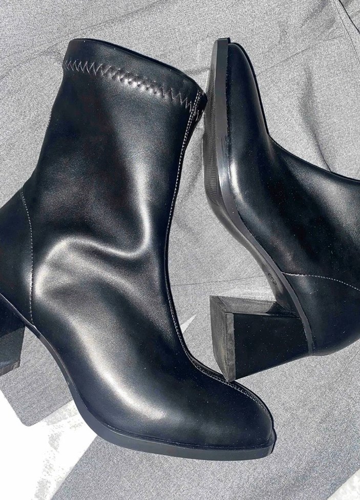 Siyah deri, tokalı ve blok topuklu kadın botları, günlük kullanıma uygun şık gotik stile sahip. Ufak bir cizigi var en son fotografta belli oluyor onun disinda bir sorunu yok
