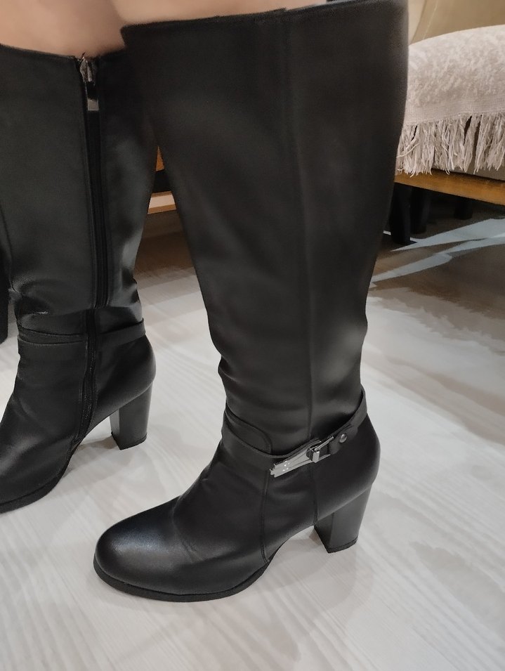 Ofis kullanımı için uygun, tokalı ve blok topuklu siyah deri dizalti botlar, gotik tarzda. 1 kez giyildi