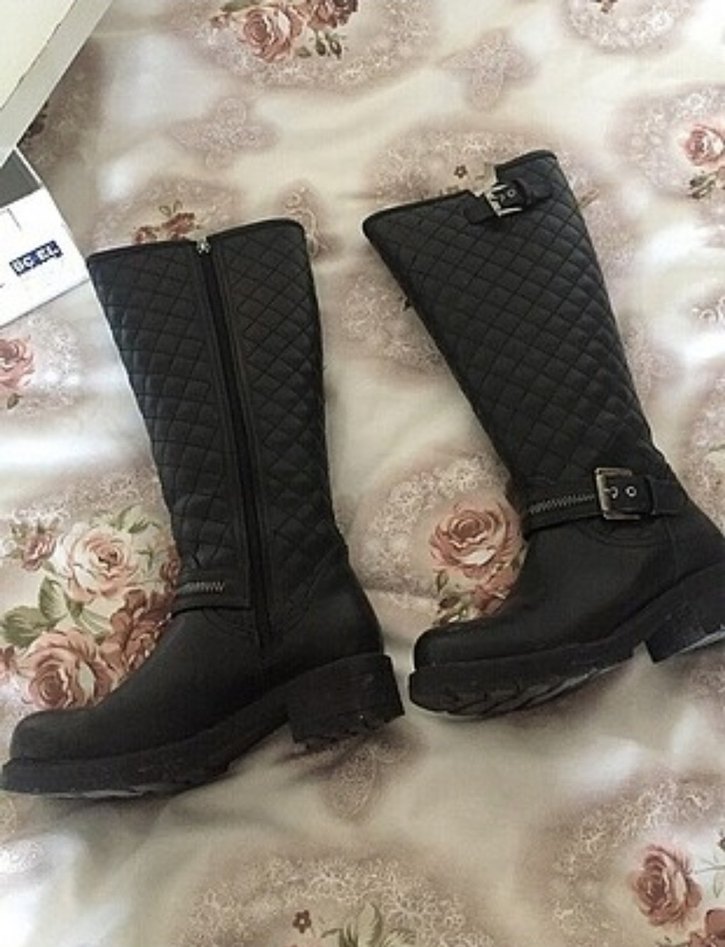 Deri, tokalı ve kapitone detaylı siyah dizüstü botlar, kalın topuklu ve rahat bir tarz sunar.