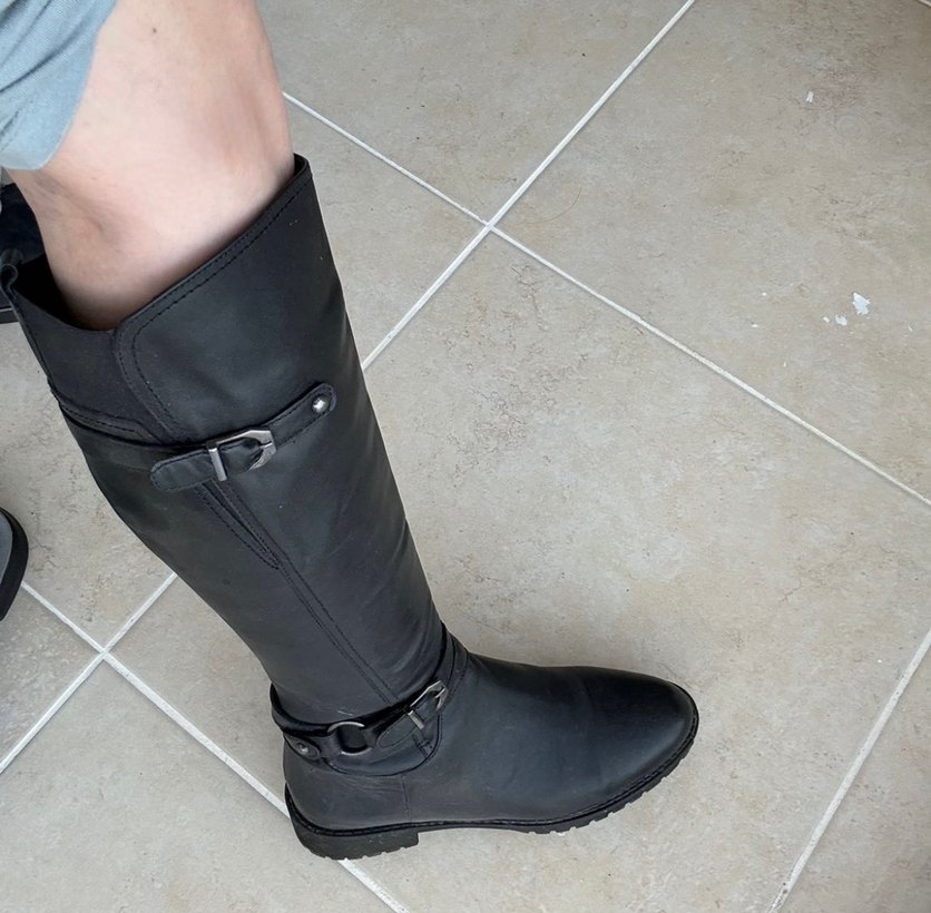 Az kullanıldı. Siyah deri dizüstü bot, tokalı kayışlar ve blok topuklu, günlük kullanım için trend gotik tarzı sunar.