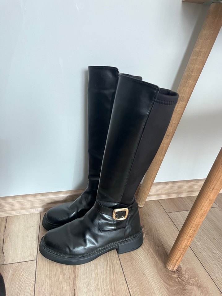 Siyah deri dizüstü botlar, kalın topuklu ve tokalı detaylı, düz ve desensiz tasarıma sahip.