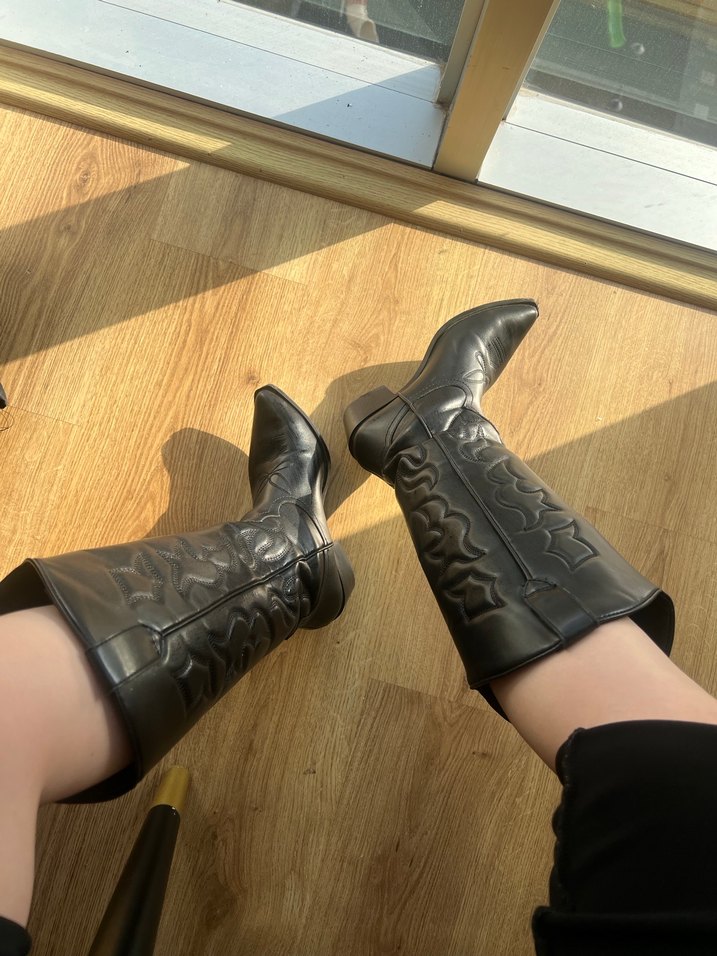 Siyah deri, tokalı dizüstü botlar, blok topuklu, gotik ve bohem tarzı bir arada sunar, günlük kullanıma uygundur. 4-5 kez kullandım