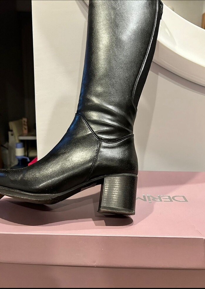 Siyah deri, tokalı detaylı ve blok topuklu dizüstü kadın çizmesi. Desensiz, gotik ve Paris tarzını birleştirir, ofis için uygundur.