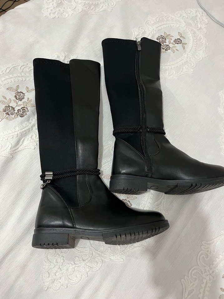 Siyah deri, tokalı dizüstü kadın çizme. Blok topuklu, desen içermeyen bu çizme rahat ve şık, günlük kullanım için uygundur.
