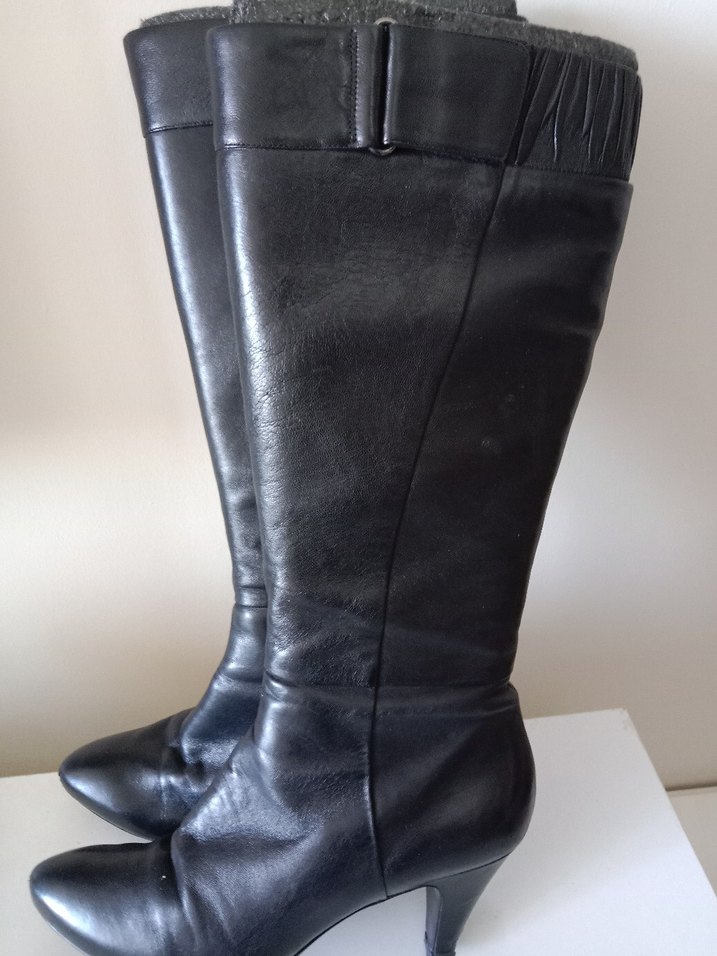 Siyah deri, tokalı ve stiletto topuklu dizüstü çizme, klasik şıklık için uygun.