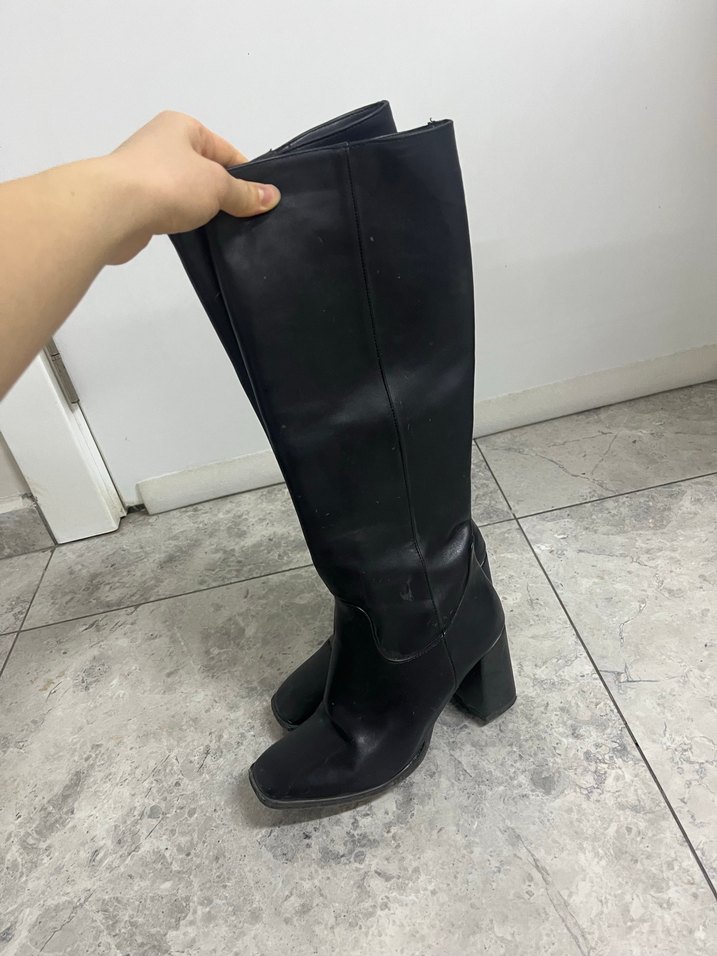 Siyah Deri Tokalı Dizüstü Topuklu Çizme