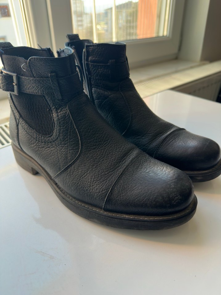 Siyah deri, tokalı erkek biker botları. Koyu renk, desensiz ve günlük kullanıma uygun, trend sokak stiline uygun.