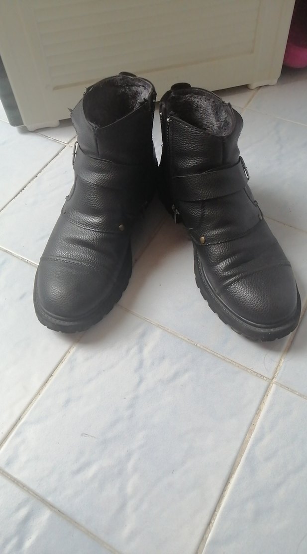 Siyah deri tokalı biker bot, minimalist tarzda ve günlük kullanım için dayanıklı tabanlara sahip. İç taban çıkmış yeni alınması gerekiyor