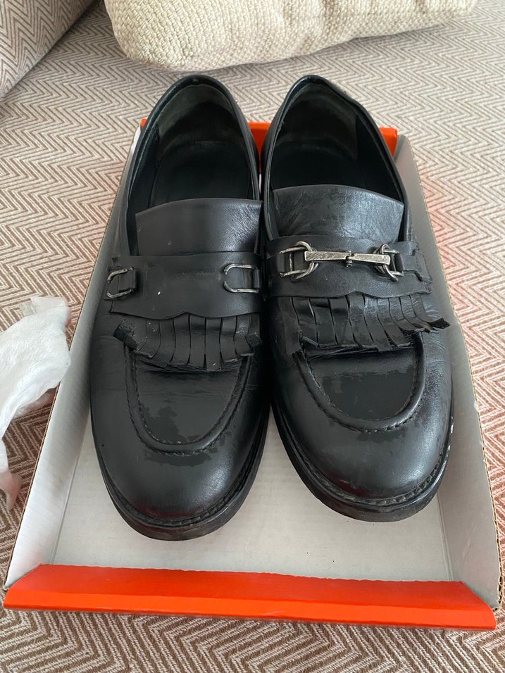 Siyah deri, tokalı ve desen içermeyen erkek loafer ayakkabı, sokak stili için uygundur. Bir tanesin öndeki tokadı düştü. 42 numara. Görsellerde mevcuttur.